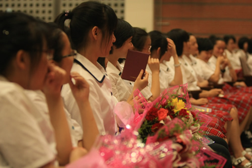 最后,毕业生代表们向学校领导和全体初三老师们献上了寄托了同学们感恩的鲜花。本届初中毕业典礼在《友谊地久天长》的歌声中圆满结束。