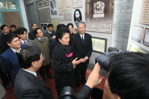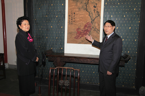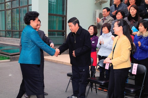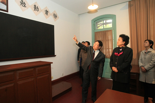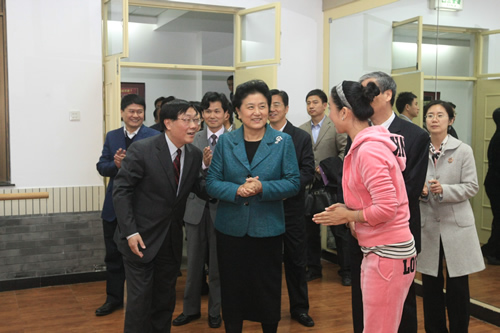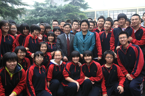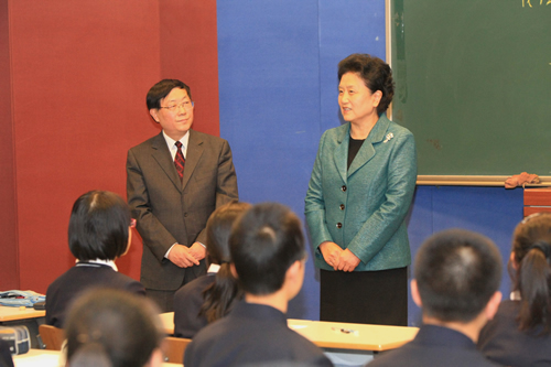 刘延东同志在刘沪校长陪同下,参观了中国古代文化研修室(杏坛)和鲁迅文学研修室(三味书屋),参观了钱学森纪念馆。领导来到舞蹈教室观看舞蹈团活动,同学们表演了舞蹈《远方的客人请你留下来》。在数字化物理实验室,刘延东同志仔细观看了同学们的物理实验。在演播室,刘延东同志与高一钱学森班同学们见面并讲话,她希望同学们大力学习和弘扬钱学森忠诚于祖国和人民的伟大爱国精神、敢为天下先的创新精神、尊重规律的科学精神和勤奋刻苦的务实精神,全面发展,增长本领,成为优秀建设者和接班人。