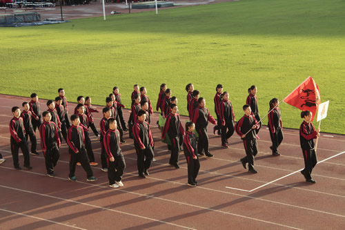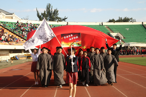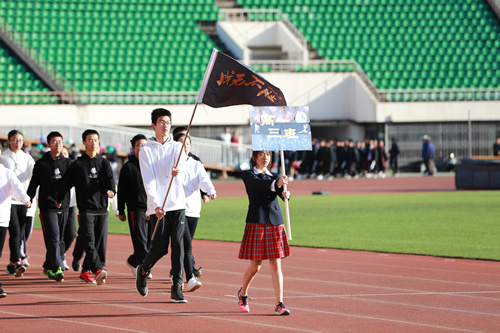 入场式上,各班同学围绕“中国梦 附中情”的主题,用新颖别致的入场创意,为老师和同学们呈现了一场精彩的视觉盛宴。初一同学是第一次参加学校的运动会,他们朝气蓬勃、神采飞扬。有的班同学在旗手的带领下,喊出了“少小多才学,平生志气高”的口号。高中年级同学的方阵创意新颖,有的班分为三部分,分别代表着建校初期、民国和新时代时期的附中学子形象。新时代的他们正在跟随前人的脚步勇敢的向前迈进。有的班同学身着汉服,高举章草“壹”字大旗,队伍排成一个“人”字,展示他们“要成材,先成人”的班训。这些精心设计的方阵和口号无不体现了学生们对班级、学校和祖国的热爱之情。王莉萍校长发表了热情洋溢的讲话并宣布运动会开幕。