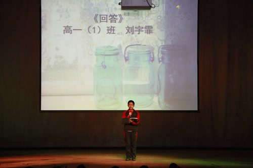 爱国之歌余音缭绕,朗诵会已进入第二章――“心灵的吟唱”。浑厚的滔滔江河般的声音化成小河,奏出舒缓而轻快的旋律。高一(5)班程子研同学的原创诗歌《那些年》让同学们深受触动。高一(4)班的施浩、邯翘同学在朗诵诗歌的同时加入了表演,温婉的嗓音和动人的表演将同学们带入了诗歌婉转缠绵的意境中。