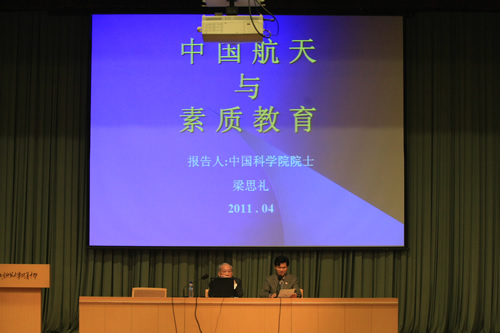 本次演讲适逢天宫一号顺利发射升空,梁思礼院士在百忙之中来到我校。他首先向我校一百一十周年校庆表达热烈祝贺,特别为我校能培养出像中国航天事业奠基人钱学森院士、中国第一枚导弹设计师梁守