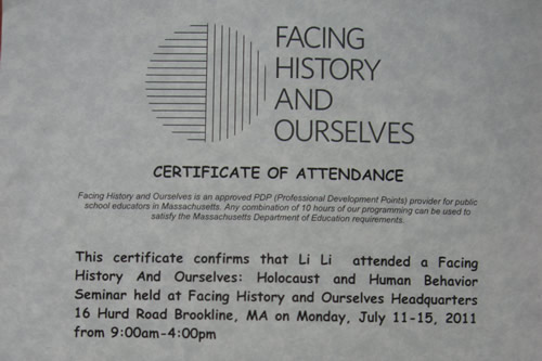 2011年7月11日-15日,我校李莉老师参加了该组织的研讨会。研讨会以二十世纪初纳粹大肆屠杀犹太人为主题,教学过程灵活多样,通过阅读大量历史文献以及相关的诗歌、戏剧和小说等,聆听二战幸存者的亲身讲述,进行多种多样的分组活动,积极与来自不同文化背景的参与者进行课堂讨论,撰写课后心得体会等。课程将历史教学与德育教育融为一体,充分激发学生的批判性思维,引导学生思考人类的尊严、道德、公民职责等,弘扬公正、责任、宽容的多元价值观念。其教育理念带给与会教师许多思考,教学策略具有操作性,对我国历史教学有一定的启发意义。