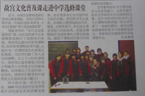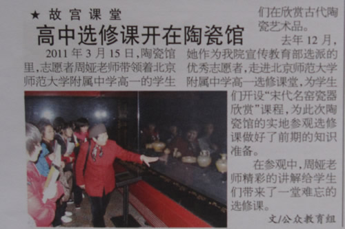 “故宫双语讲解”是我校历史组推出的一门校本课程,将课本知识和故宫博物院的资源进行整合,加强学校和社会的合作办学。今年的选修课中,我校邀请故宫的优秀讲解员走进中学课堂,给同学们上了“宋代名瓷欣赏”一课。之后,同学们又走出校门,把选修课直接开到故宫的陶瓷馆。这种合作学习的方式得到了故宫宣教部的大力支持,并在《故宫人》中进行了报道。