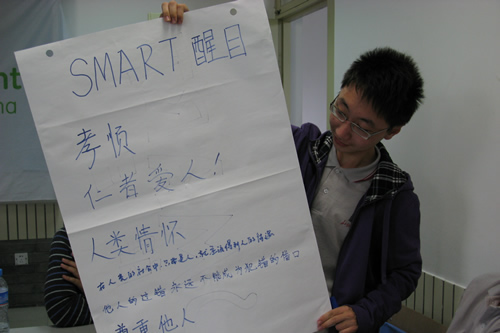在同学们纷纷对发表了自己的感想后,志愿者们又讲述了一系列蕴含道德深意的社会故事,提出在面对两难处境的情况下究竟应该怎样妥善处理才符合正确的道德标准的问题,同学们进行了激烈的讨论。在同学们的热情越发高涨起来时,志愿者们将当天的活动主题抛出:请同学们分组讨论他们各自最为推崇的生活准则,并进行总结分享展示。五组同学分别从“百善孝先”、“弃恶扬善”、“诚爱勤勇”、“好好活着”、“人类情怀”等几方面立意进行了准则的分享。