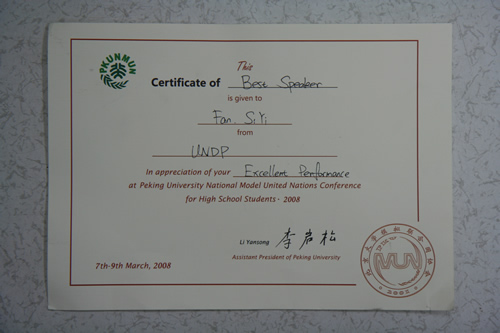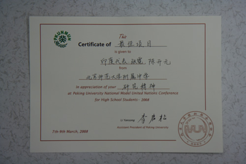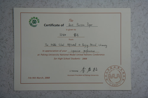 我校学生在08年北京大学全国中学生模联大会中取得好成绩