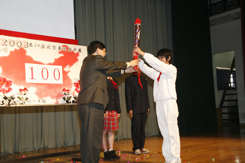 同学们刚刚结束紧张的期中考试,就身着整齐的校服,佩带鲜艳的红领巾,手持小国旗和五环旗,满怀喜悦的心情参加了庆祝仪式。
