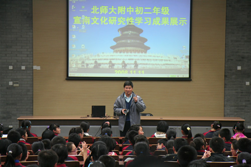 最终,北师大附中初二年级历时4个月之久的宣南文化研究性学习活动,在大家的掌声中圆满拉上了帷幕。这是一次现实与历史的碰撞,这是一次生活与文化的探访。宣南文化以其各具特色的文化形态,感染了年轻一代的莘莘学子。相信通过这次非同寻常的文化熏陶,他们对于北京的历史会有更深刻的体验;而通过研究性学习的实践,他们会更加懂得怎样与他人交流及合作。这必将促进学生形成主动探究的学习态度,促进他们树立社会责任感和历史使命感,促进他们发展以至完善作为社会一分子的自我主体。