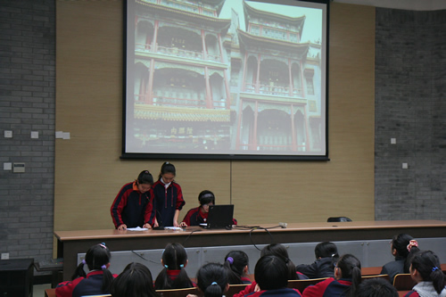 2008年7月,综合课程处向各班发放由大栅栏街道提供的《宣南文化百题知识问卷》,并布置暑期研究课题。由于宣南文化包括9个文化系列,即以大栅栏为代表的商业文化、以天桥为代表的老北京民俗文化、以琉璃厂为代表的京城士文化、以京剧为代表的戏曲文化、以各地会馆和名人故居为代表的会馆宅邸文化、以牛街为代表的回族文化、以法源寺和先农坛为代表的坛庙文化、以鲁菜和回民小吃为代表的饮食文化和以大观园为代表的红楼文化,因此各班分别拟定9组,各自负责1个系列的调查研究。利用暑期时间,通过资料查阅、人物访谈或实地考察,完成小组调查报告。