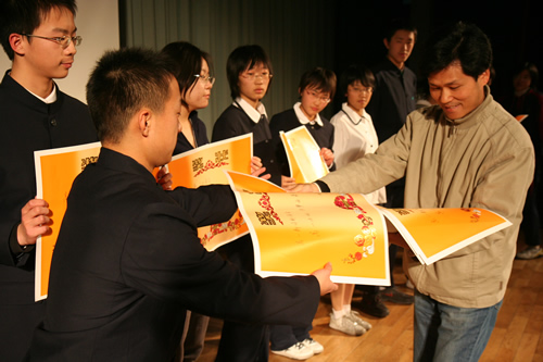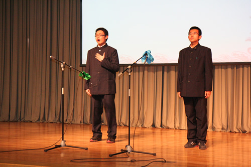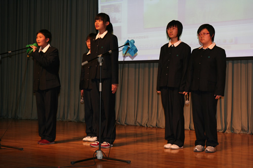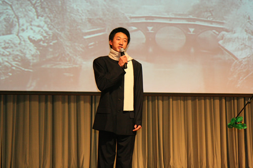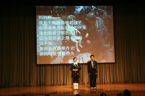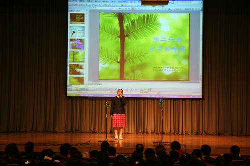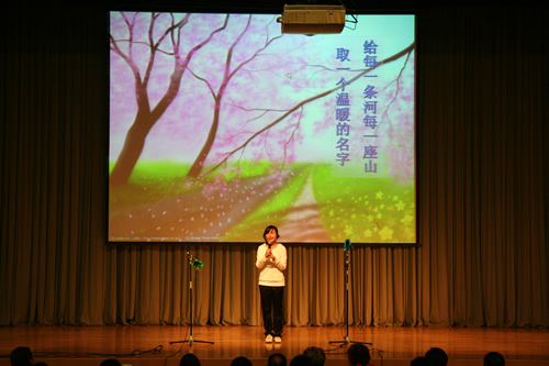 为配合现代诗歌单元教学,搞好语文综合实践活动,12月15日,高一年级举办了“点亮心灯”新诗朗诵会。会前学生在语文老师的指导下,做了精心的准备。朗诵会分为“我的中国心”、“心灵的吟唱”、“人性的光辉”、“我思故我在”四个乐章。篇目中既有《再别康桥》、《祖国啊,我亲爱的祖国》等现当代经典名篇,也有《生死不离》等纪念汶川地震的新作,还有《槐树,你被大风吹弯了腰了》等由学生创作的新诗。