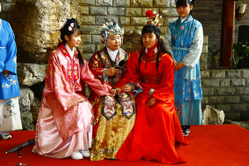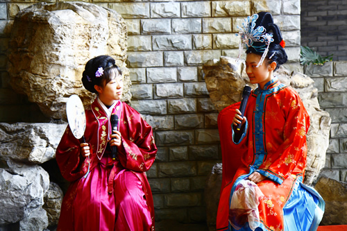 全年级的学生分为两个大组,一组先在红楼礼堂听红学专家周汝昌之子周建临先生的专题小讲座,另一组学生以班为单位在导游的引领下,参观怡红院、潇湘馆、稻香村等重点景点。在讲座之后,本年级的十位学生扮演贾母、林黛玉、贾宝玉、王熙凤等角色,为同学们演出了自排的课本情景剧片段。