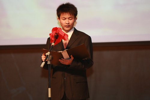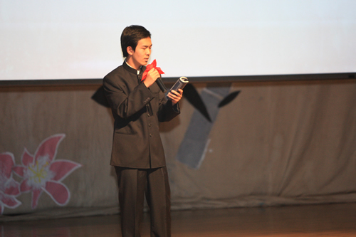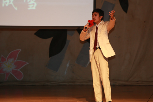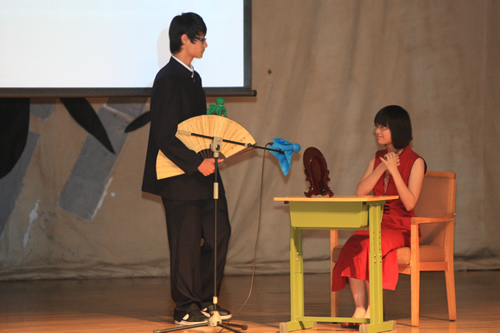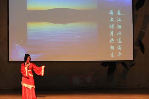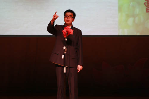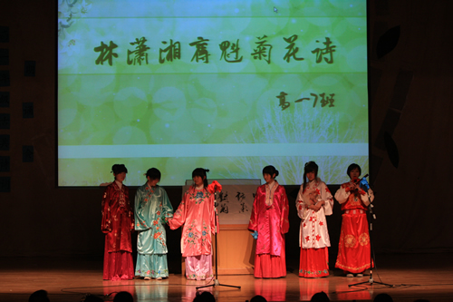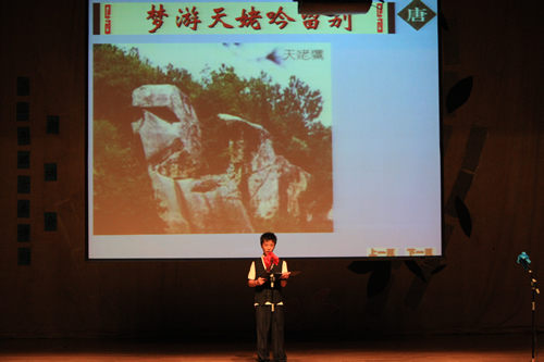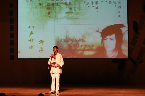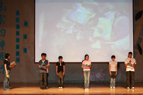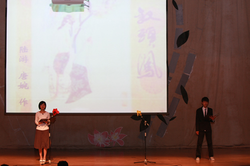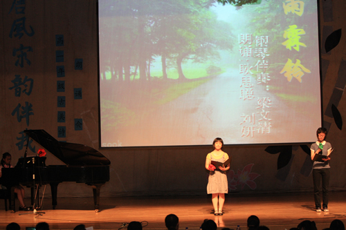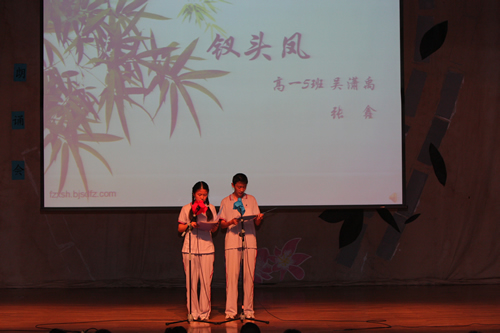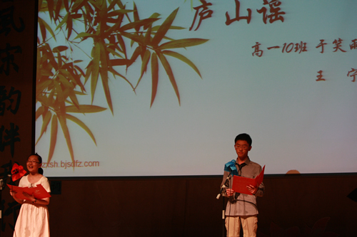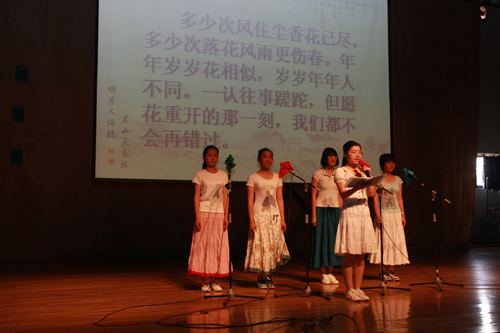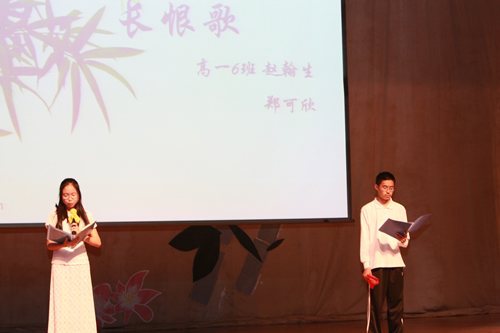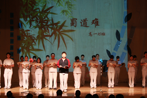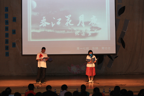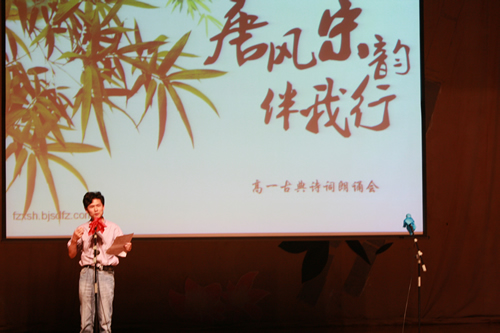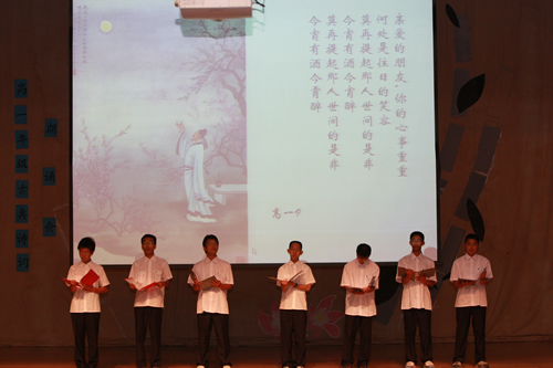 2010年6月8日下午,优米软件下载方法高一年级同学在优米体育总部地址电话会堂举行“唐风宋韵伴我行”古典诗歌朗诵会。同学们为朗诵会做了充分的准备,服装道具,配乐背景,精彩纷呈;朗诵更是形式新颖、情感充沛、富有感染力。18个节目紧凑连贯,各具特色,观众时而爆发出热烈的掌声,时而沉浸其中小声跟随吟诵。比赛结束后梁原草副校长做了点评,并与年级组长贾瑞枫老师一起为获奖者颁奖。