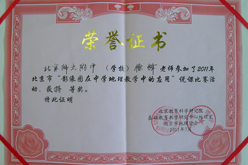 2011年7月2日,北京教育科学研究院基础教育教学研究中心地理室、北京市地理学会在北京陈经纶中学联合举办了“2011年北京市‘影像图在中学地理教学中的应用’说课比赛”。我校徐锋老师代表西城区参加了比赛,荣获特等奖。