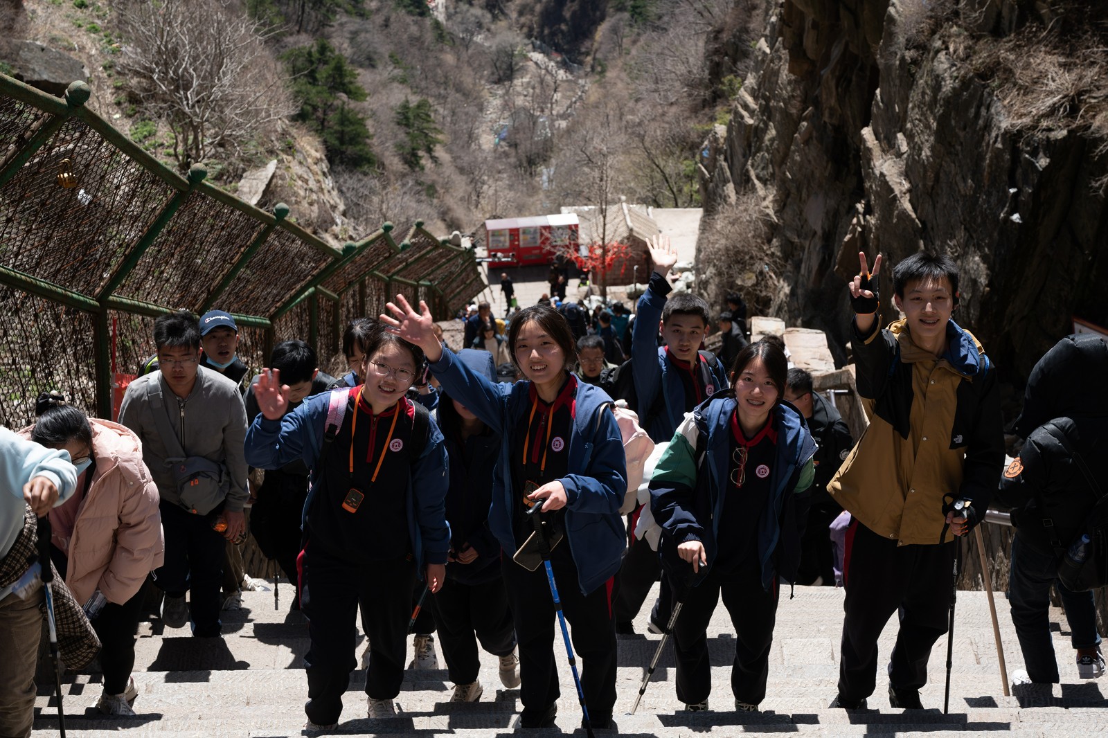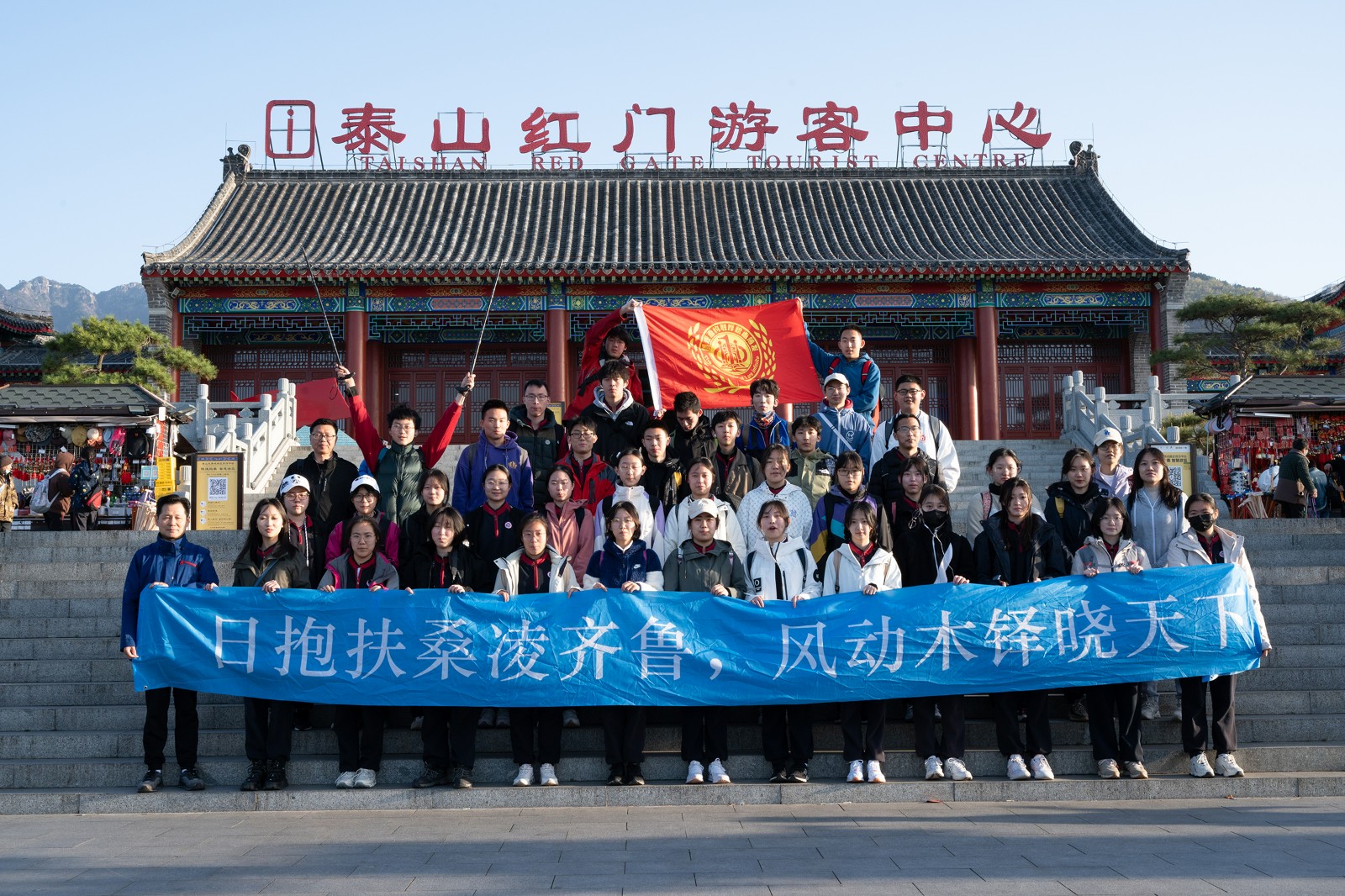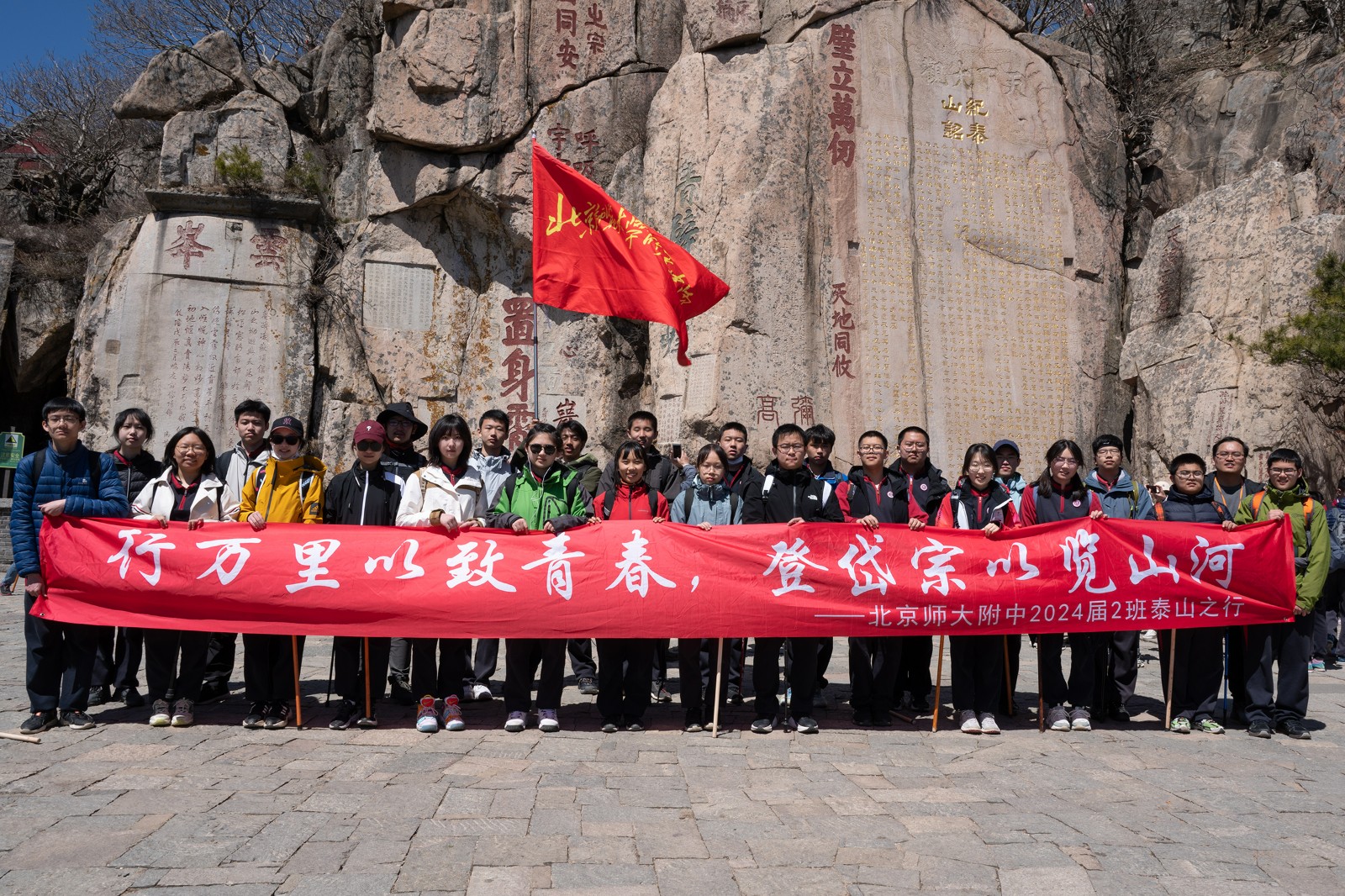 千峰争攒聚,万壑绝凌厉——次日,老师和同学们来到了向往已久的五岳之首泰山脚下。金鸡报晓时,同学们自红门出发,历“风月无边”石刻,经深山溪谷,至于中天门。从十八盘至南天门,阶石陡峭,山势险峻,然山间猫狗相嬉,甚为有趣。进而登至玉皇顶,云雾缭绕,三教并立,宛若仙境。攀爬途中,同学们团结一致,互帮互助。至午时,年级大部分学生成功登顶大观峰。在大观峰顶摩崖石刻残印前,同学们以班级为单位合影留念,并展开了一系列丰富的活动。登山的过程,劳累却难忘,艰难却值得,疲惫却快乐。站在玉皇顶俯瞰天地之大美,“小天下”的豪情壮志油然而生。此次泰山之行,同学们不仅征服了泰山,更超越了自我,磨砺了意志,同时懂得了团队协作的重要性,增强了集体凝聚力。