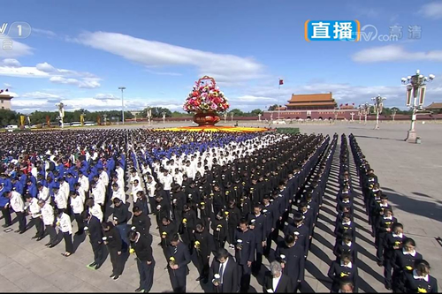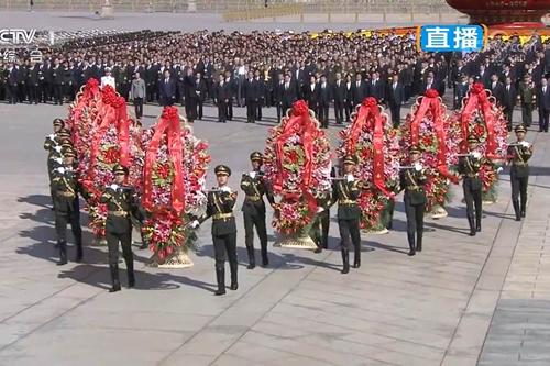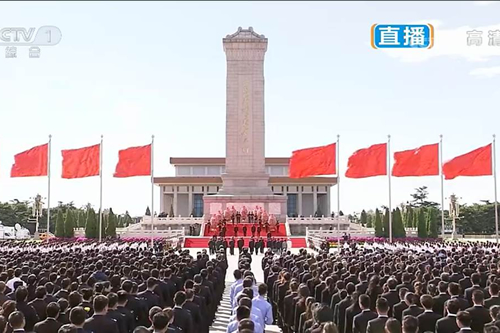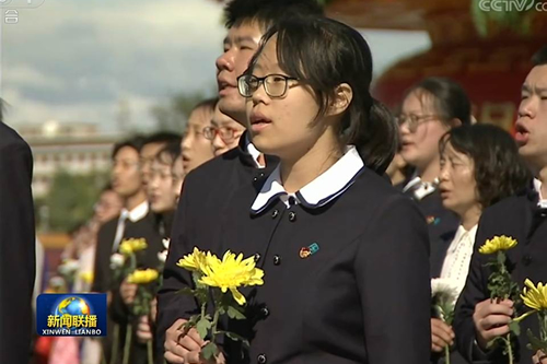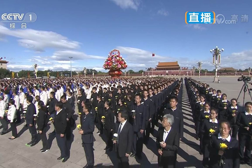 上午十点,敬献花篮仪式开始,附中师生和各界代表满怀激情,共同高唱国歌。国歌唱毕,全场肃立,向为中国人民解放事业和共和国建设事业英勇献身的烈士默哀。在礼兵整齐铿锵的步伐中,在庄严深情的《献花曲》中,党和国家领导人向纪念碑敬献花篮。随着各界纪念人群的队伍,附中师生踏上红毯、手持菊花拾级而上,庄重肃穆地将鲜花敬献在纪念碑白色的基座上,并饱含深情地瞻仰了雄伟庄严的人民英雄纪念碑。