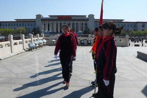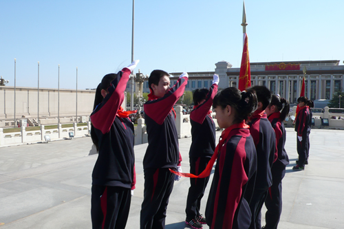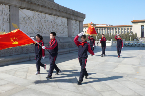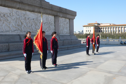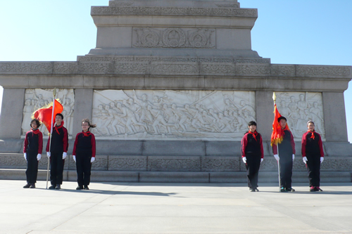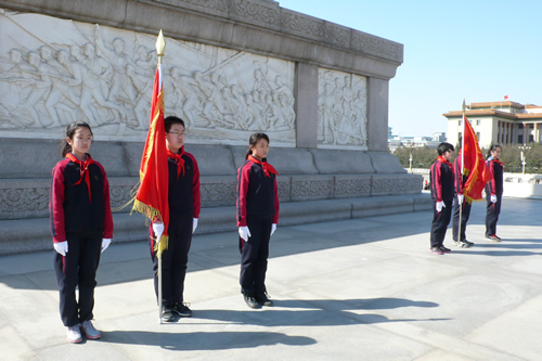 2012年4月4日,我校初一年级18名少先队员来到天安门广场人民英雄纪念碑前站“首都少年先锋岗”。适逢清明假期,上、下午各需站岗一小时,比平时的任务更艰巨,广场上不时刮来阵阵大风,少先队员们一直一动不动,昂首挺胸,少先队旗迎风飘扬着。