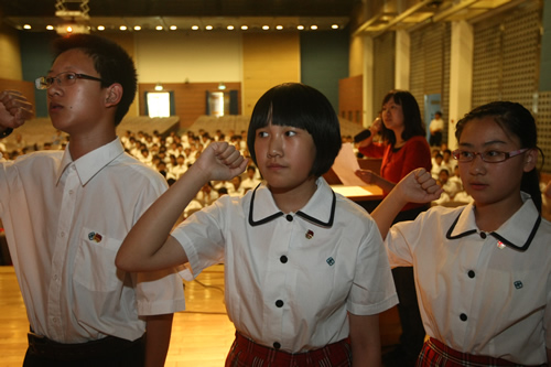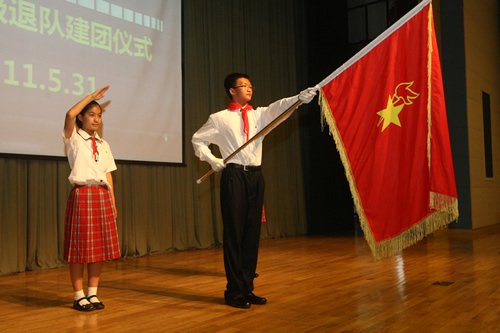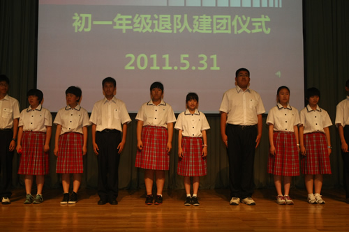 2011年5月31日下午,在校团委的组织下,2010-2011学年度初一年级退队建团仪式在优米体育总部地址电话会堂隆重举行。梁原草副校长、教导处况莉主任出席了仪式。