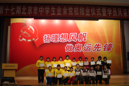 11月2日,第十七期北京市中学生业余党校结业仪式在附中百年会堂举行。团市委书记刘剑,团市委副书记王粤等相关领导和宣武区团区委书记王干,区教工委副书记吴君楚及我校刘沪校长出席大会。