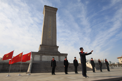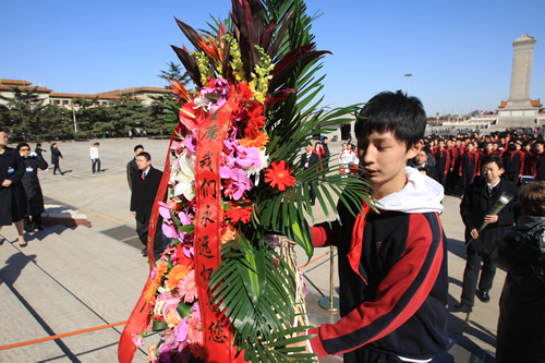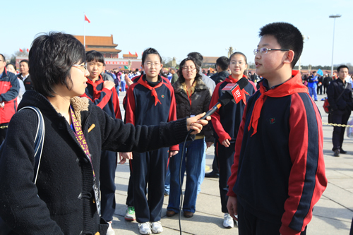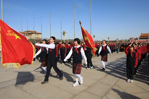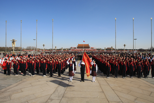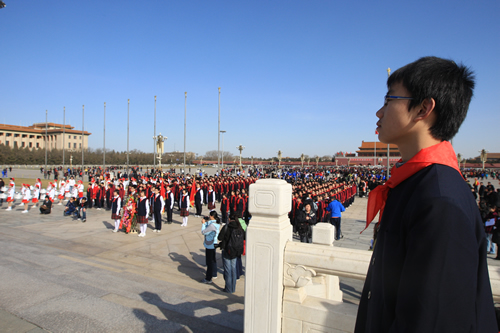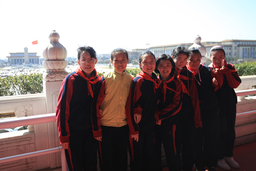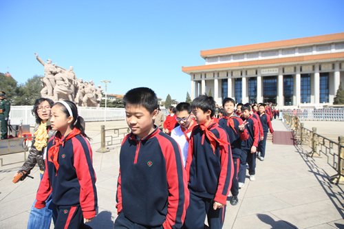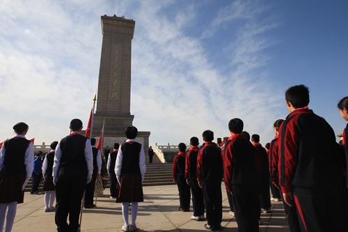 2010年4月1日,晴空万里,天安门广场游人如梭。我校初一年级250余名学生在教导处主任况莉老师、年级组长周丽敏老师、校团委书记张帅老师的带领下,来到人民英雄纪念碑前参加“首都少年先锋岗”启动仪式,深切缅怀革命先烈。仪式结束后,同学们还参观毛主席纪念堂和天安门城楼。大家纷纷表示:今天的幸福生活来之不易,是千千万万的革命先烈用生命和鲜血换来的,我们一定要好好学习,为建设祖国作出贡献。