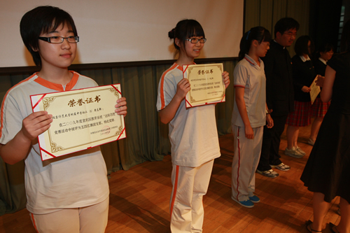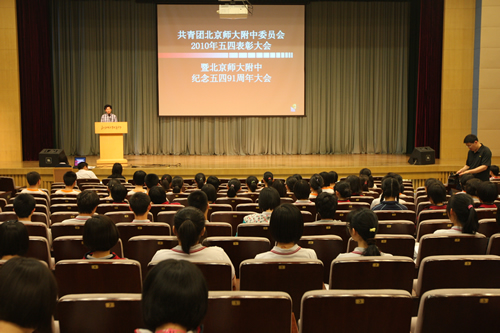 5月26日中午,2009-2010年度共青团五四表彰大会在礼堂隆重召开。许建勇副书记、教导处况莉主任出席大会并为获奖团体及个人颁奖。校团委副书记高二(11)团支部安珊珊同学、高二(2)团支书随鑫辉同学、高一(5)团支书马吉童同学分别代表校团委、区教育系统优秀团支部做工作汇报。梁原草副校长出席表彰大会并讲话,他向获奖团体及个人表示祝贺,充分肯定校团委一年来的工作并对全校团员提出新要求。