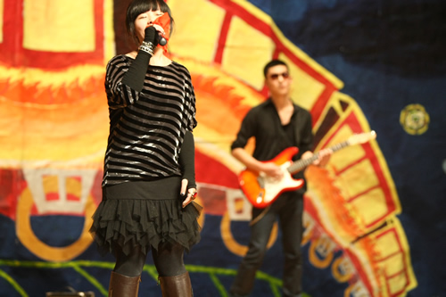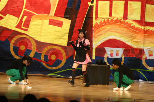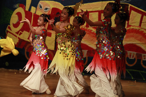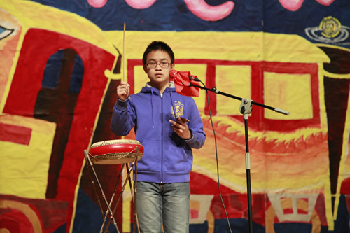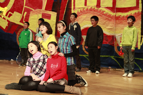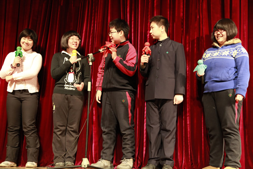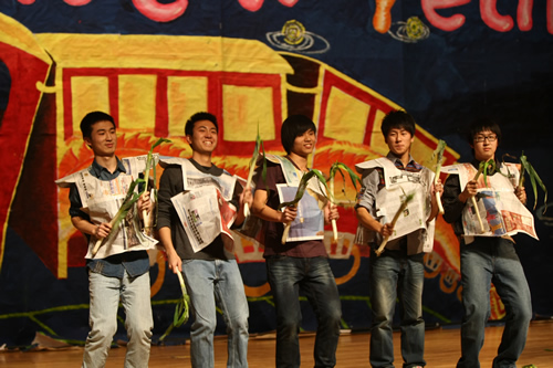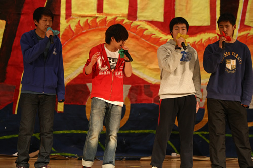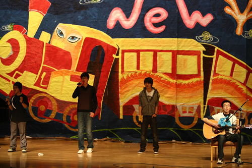 附中学生会的同学利用课余时间绘制了主题为“星空”的幕布,将畿米的漫画星空与中国传统的金龙结合在一起,绘成美轮美奂的背景。