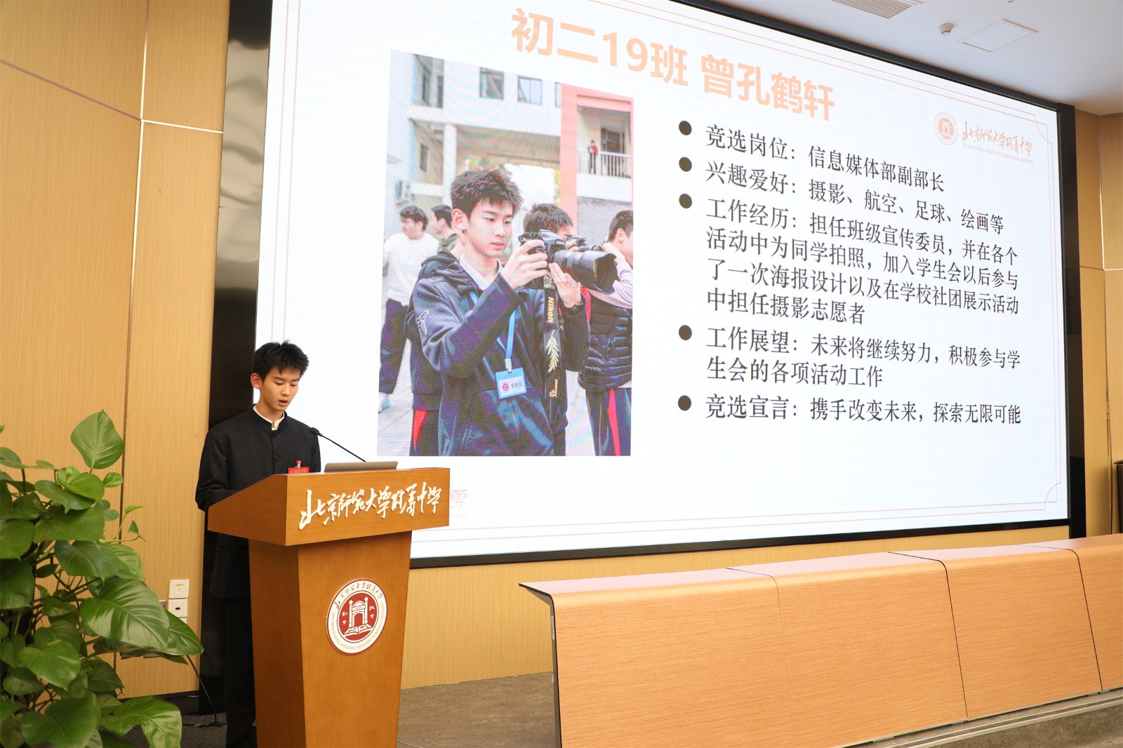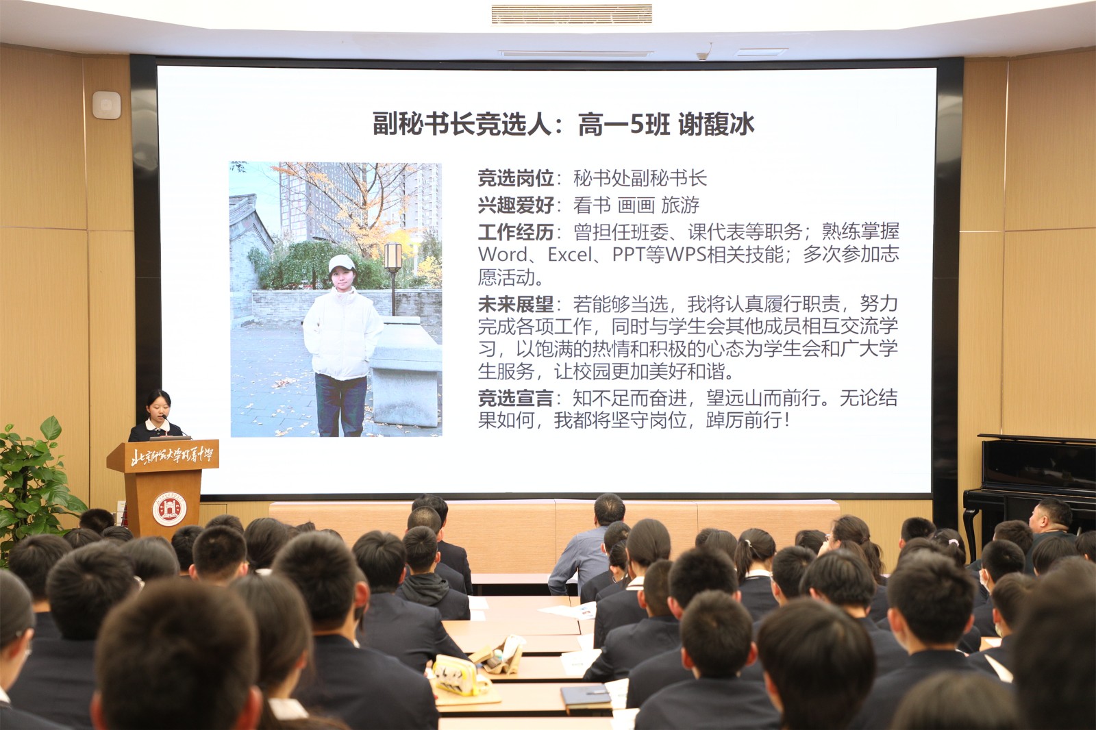 校学生会周子愉同学代表第106届学生会作了以《敢于创新 向未来再出发 为附中之发展而奋斗》为题的工作报告,对第105届学生会的工作成果进行了全面总结。过去的一年中,学生会举办的中华文化与爱国主义相关主题活动,丰富了同学们的课余生活。同时学生会还组织了多项志愿服务工作,帮助同学们提高综合素质,为同学们营造了促进自我发展的良好氛围。报告还对学生会工作提出改进方向,学生会将在今后的工作中及时进行反思总结、提高各部门凝聚力、对学生建议进行广泛收集与认真反馈。